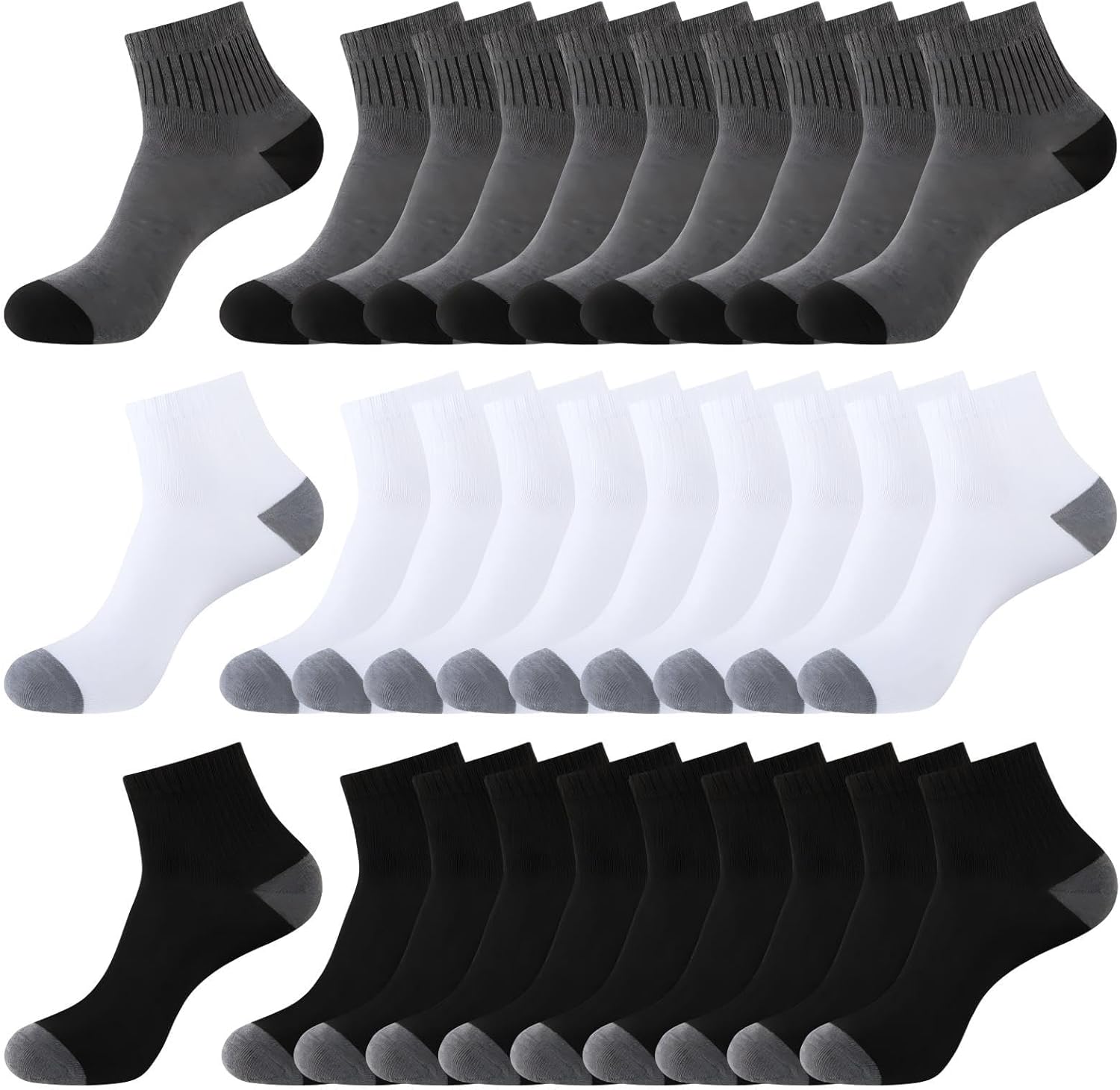 LITERRA 30-Pack Low Cut Ankle Socks - 4 Style Bundle(Black/Striped/Accented Designs for Men & Women)CORE FEATURES✔ Triple Style Set - 30 pairs (10 solid black with grey accents + 5 black with grey toes + 5 sporty striped designs + 10 pairs sporty stripes with designed grey accents) ✔ Universal Fit - Fits shoe sizes 8-12 (sock size 10-13) - men & women✔ Breathable Comfort - Thin, Lightweight fabric keeps feet fresh and cool✔ Stay-Put Design - No slipping or bunching during activities✔ Reinforced Durability - Strengthened stitching for long-lasting wearTECH SPECS◈ Material: 97% Polyester + 3% Spandex◈ Thickness: Medium-lightweight, ideal for all seasons◈ Care: Machine wash cold - retains shape & softnessPERFECT FOR:✅ Daily Wear - Work, casual, gym✅ Team Activities - Sports teams, charity events✅ Bulk Gifting - Office presents, party favors✅ Travel Essentials - Compact & versatileWHY CHOOSE LITERRA?★ All-Season Comfort - Special ventilation channels★ Smart Value - 30 pairs = 4+ weeks of fresh socks★ Style Variety - Classic, sporty, and modern designs to suit any look"The perfect blend of comfort, durability and style for active lifestyles!"
